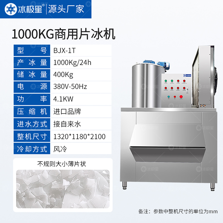 【产品描述】:冰极星1000公斤片冰机日产公斤1000KG/24小时,制冰快,产量足,使用寿命长,主要应用超市、酒店、自助餐、火锅店、水产海鲜、蔬果保鲜,食品厂等用冰场所.