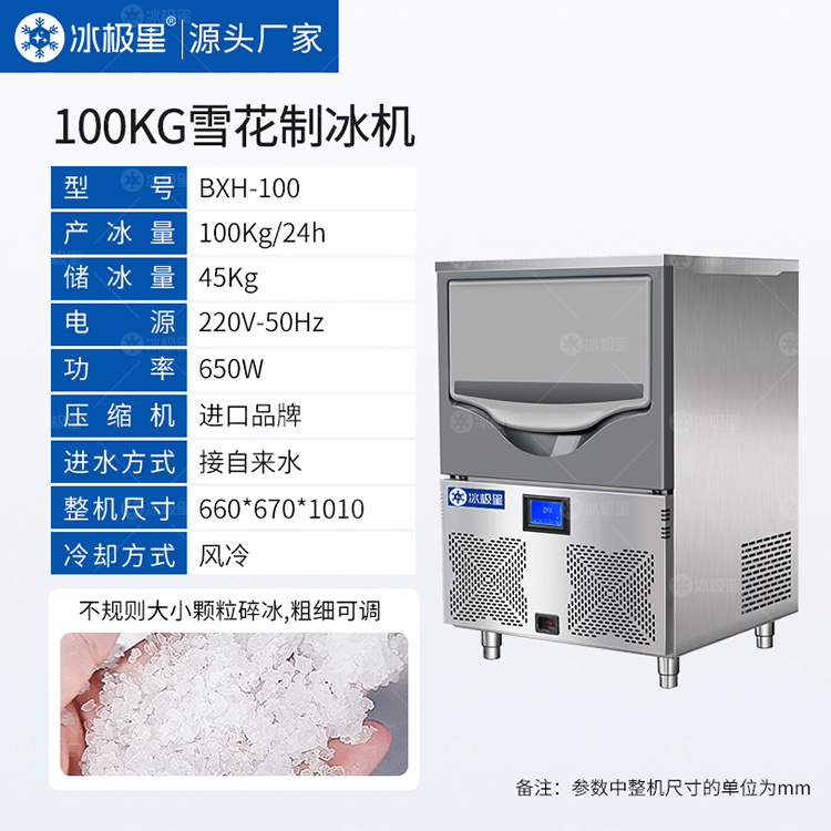 【产品描述】:冰极星100公斤雪花制冰机主要应用于实验室,料理店,刺身店,酒店,医院,水产海鲜,火锅店,蔬果保鲜等用冰场所.