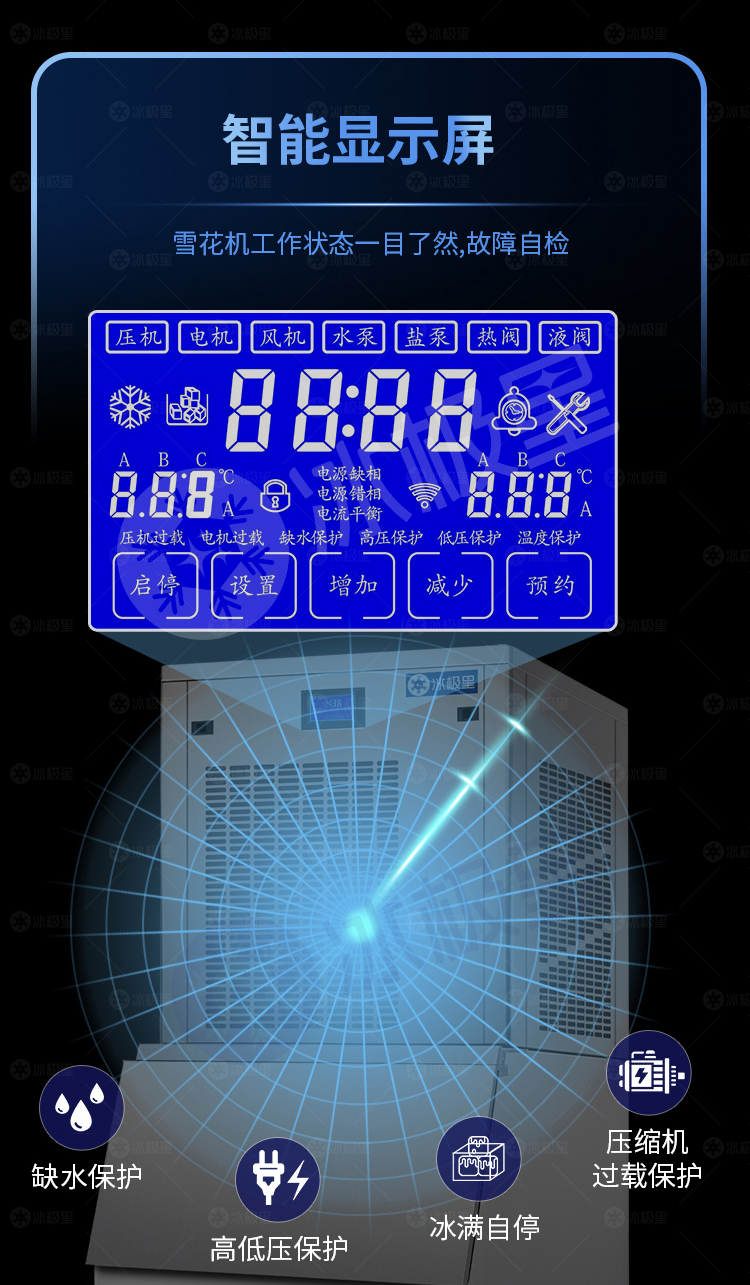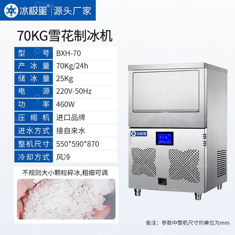 【产品描述】:冰极星70公斤雪花制冰机主要应用于实验室,料理店,刺身店,酒店,医院,水产海鲜,火锅店,蔬果保鲜等用冰场所