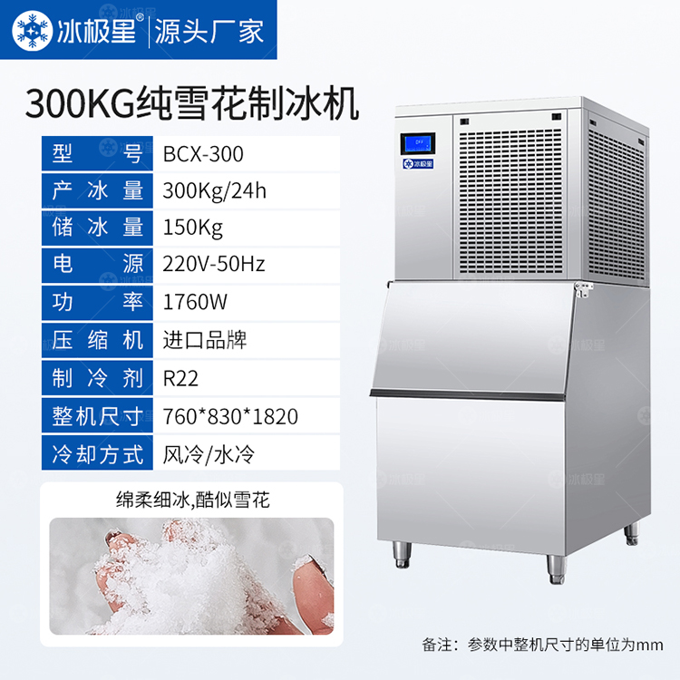 【产品描述】:冰极星300公斤纯雪花制冰机,24小时产冰量为300公斤,冰型为绵柔细冰,酷似雪花,易堆放,方便做各种造型;适用于海鲜姿造店,火锅店,酒店,自助餐,料理店等,源头工厂直销,价格优惠!