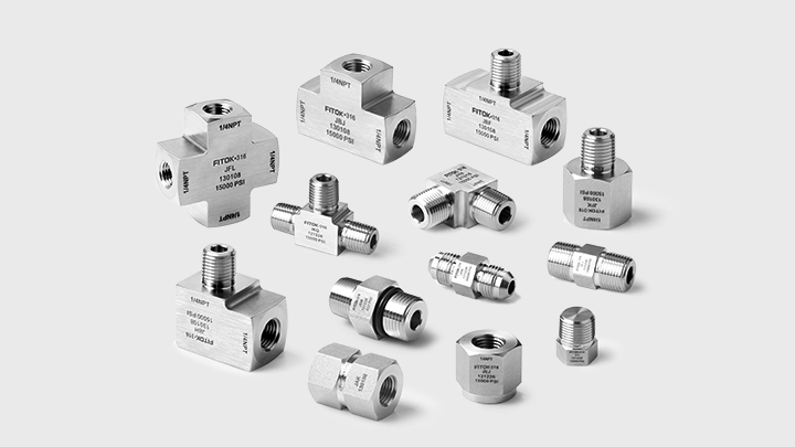 PMH 系列中高压螺纹接头,螺纹采用硬化和抛光处理,避免阴阳螺纹咬死并延长接头寿命,可提供可靠的密封性能,最大工作压力可达 60, 000 psig (4,137 bar)。接头内部弯头通道圆弧连接,确保流体平稳流动。PMH 系列中高压螺纹接头有多种接头类型(直通、弯头、三通和四通等)和螺纹规格(NPT 螺纹、ISO 螺纹、SAE 螺纹和 JIC 螺纹等)可供选择。