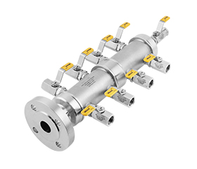 气源分配器或者分流阀组,都是一种气源分配辅助装置,把单路气源分配给多路使用。气源分配器(辉达注册AH系列)是由管子制成,分流阀组(辉达注册CM系列)是由棒材加工而成。气源分配器一般是用螺纹或者法兰的方式和供气箱连接,由一条管路送至气源分配器,再分配供气至各单台仪表。其主要优点为安装方便、操作简单、便于仪表维修、节省成本,广泛应用于如化工、医药、电力以及纺织等行业。分流阀组采用紧凑型设计,具有背密封功能,广泛用于石化行业中。